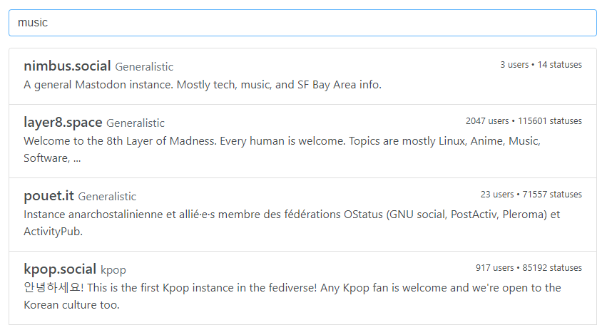 Since Mastodon is a network of federated instances, one important decision to make is which instance to join. Most instances try to attract a certain audience such as people from specific areas, people with similar interests or people speaking the same language. Joining an instance will therefore have a profound impact on the user experience. While it still possible to follow and be followed by everybody in the Fediverse, the local instance determines what chatter users see in their local timeline. It is therefore advisable to explore Mastodon before joining and try to find a suitable instance. Instances.social is very helpful in finding a suitable instance. It provides a wizard and a keyword search.
